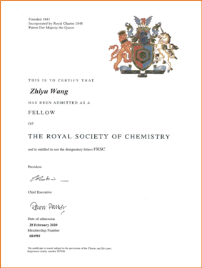 Professor Wang Zhiyu from State Key Laboratory of Fine Chemicals, Dalian University of Technology has received the certificate announcing that he has been elected as Fellow of the Royal Society of Chemistry in recognition of his research contributions.