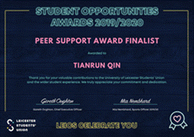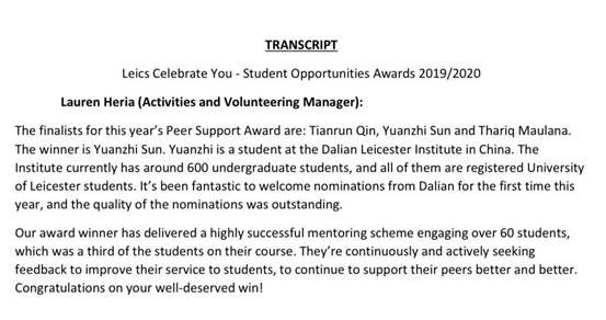 The University of Leicester (UoL) recently has announced the winners of the Student Opportunities Awards 2019. It is the first time for students from Leicester International Institute (DLI) to apply for the awards this year. Among them, Sun Yuanzhi, a junior undergraduate student, won the Peer Support Award, which makes him the first winner of the award from DLI. In addition, Qin Tianrun, a sophomore, was nominated for the Peer Support Award.