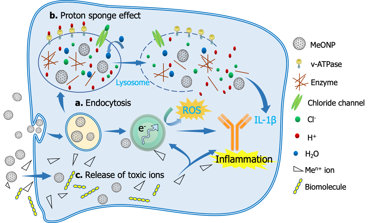 Figure 2.Proposed schematic image of inflammatory mechanisms by metal oxide nanomaterials (MeONPs). (A) Endocytosis: MeONPs with a positive ζ-potential were most internalized by THP-1 cells and lysosomes. (B) Proton sponge effect. MeONPs with metal atom electronegativity ≤1.55 tend to trigger a proton sponge effect, followed by lysosome damages, leakage of lysosomal contents and excess IL-1β production. (C) Release of toxic ions.
