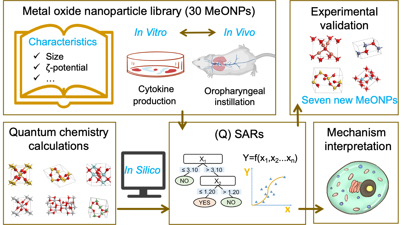 By employing metal oxide nanoparticles (MeONPs) as a model ENM, they aimed to develop QSAR models for prediction of the inflammatory potential by their physicochemical properties. They built a comprehensive data set of 30 MeONPs to screen several pro-inflammatory cytokines in THP-1 cell line. A pro-inflammatory cytokine of IL-1β could be used as an index to rank the inflammatory potential of MeONPs. Seventeen out of 30 MeONPs induced excess IL-1β production in THP-1 cells. The in vitro hazard ranking was validated in mouse lungs by oropharyngeal instillation of six randomly selected MeONPs. In vivo disease outcomes were highly relevant to the in vitro data. They established QSAR models for prediction of MeONP-induced inflammation via machine learning, with predictive accuracy (ACC) exceeding 90%. The models were further validated experimentally against seven independent MeONPs (ACC=86%). Density functional theory (DFT) computations and experimental results further revealed that the key mechanisms driving inflammatory responses of MeONPs were proton sponge effect, cellular internalization, lysosomal damage, and release of toxic ions.