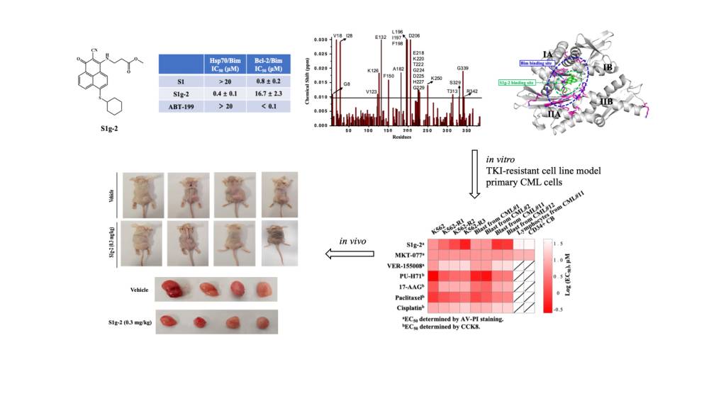 Then, the research group further developed translational medicine and innovative drug research for TKI-resistant leukemia. They screened a novel inhibitor of the Hsp70-Bim protein-protein interaction (PPI),S1g-2, from a Bcl-2 inhibitor library; this compound specifically disrupted the Hsp70-Bim PPI by direct binding to an unknown site adjacent to that of an allosteric Hsp70 inhibitor MKT-077, showing binding affinity in sub-μM concentration range. S1g-2 exhibited overall 5–10-fold higher apoptosis-inducing activity in CML cells, primary CML blasts, and BCR-ABL-transformed BaF3 cells than other cancer cells, normal lymphocytes, and BaF3 cells, illustrating Hsp70-Bim PPI driven by BCR-ABL protects CML through oncoclient proteins that enriched in three pathways: eIF2 signaling, the regulation of eIF4E and p70S6K signaling, and the mTOR signaling pathways. Moreover, S1g-2 progressively enhanced lethality along with the increase in BCR-ABL-independent TKI resistance in the K562 cell lines and is more effective in primary samples from BCR-ABL-independent TKI-resistant patients than those from TKI-sensitive patients. By comparing the underlying mechanisms of S1g-2, MKT077, and an ATP-competitive Hsp70 inhibitor VER-155008, the Hsp70-Bim PPI was identified to be a CML-specific target to protect from TKIs through the above three oncogenic signaling pathways. The in vivo activity against CML and low toxicity endows S1g-2 a first-in-class promising drug candidate for both TKI-sensitive and resistant CML. The result was published by Associate Professor Song Ting in Leukemia, the journal of Leukemia Society of America, which is ranked 3rd among hematology journals and 9th among oncology journals.
