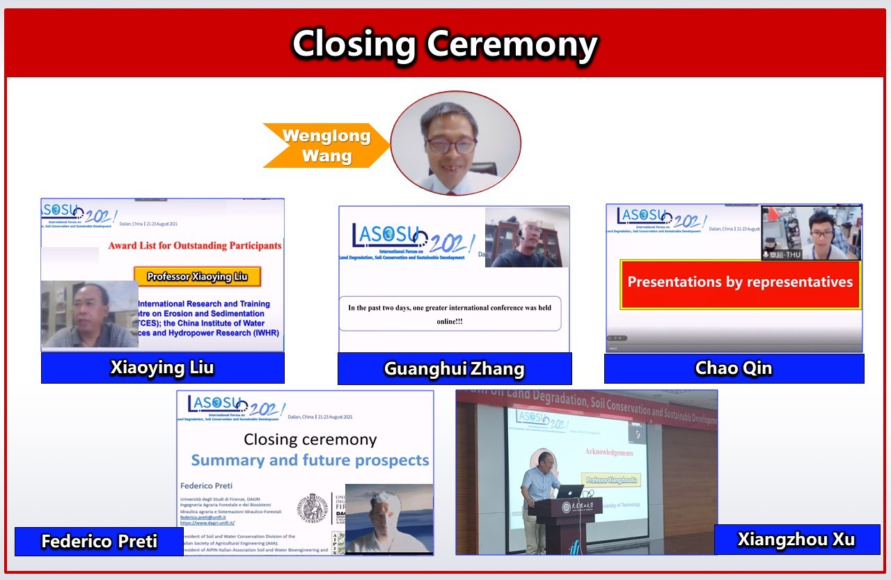 The presidents of the Organizing Committee of LASOSU2021 are Professor Ning Duihu (International Research and Training Center on Erosion and Sedimentation, China) and Professor Paolo Tarolli (University of Padova, Italy). President Ning Duihu, chaired the welcome ceremony, which was addressed by Professor Zhang Chi, Dean of the Faculty of Infrastructure Engineering, Dalian University of Technology, Mr. Li Weiguo, Director of the Water Bureau of Dalian Government (China), Professor Paolo Tarolli (Italy),Chairperson of the Organizing Committee, Professor Wang Wenlong, Director of the Soil Erosion Division, CSWCS, and Professor Giacomo Scarascia Mugnozza, President of the Italian Association of Agricultural Engineering. Academician Liu Jiangguo (USA), Academician Fu Bojie (China), Professor Vincenzo D'Agostino (Italy), Professor Cai Chongfa (China), Professor Paulo Alexandre da Silva Pereira (Lithuania) and Professor Roberto A Peiretti (Argentina) presented keynote speeches in the conference. Also an innovative slot, the Focus Group Discussion (FGD), was adopted in LASOSU2021. Professor Zheng Fenli (China) led an interesting discussion concerning Global Soil Conservation and Food Production together with 5 esteemed professors from 4 countries, Chi-hua Huang (USA), Liu Baoyuan (China), Paolo Tarolli (Italy), Altaf Ali Siyal (Pakistan), Wang Fei (China). It's worth noting that, the number of participants had reached the maximum capacity of 300 in a single Tencent/VooV meeting during this period. Finally, the closing ceremony was presided over by Professor Wang Wenlong. Professor Liu Xiaoying, the Secretary General of World Association of Soil and Water Conservation, announced the list of award recipients. Dr. Qin Chao from Tsinghua University (China), who won one of the outstanding papers, made a speech on behalf of the conference participants. The summary of the conference was made by Professor Federico Preti, president of Soil and Water Conservation Division of the Italian Association of Agricultural Engineering, and Professor Zhang Guanghui, Vice Director of the Soil Erosion Division, CSWCS. By the end of the conference, Professor Xu Xiangzhou, the head of the conference team in Dalian, delivered a speech to extend his thanks and delights in organizing the LASOSU2021.