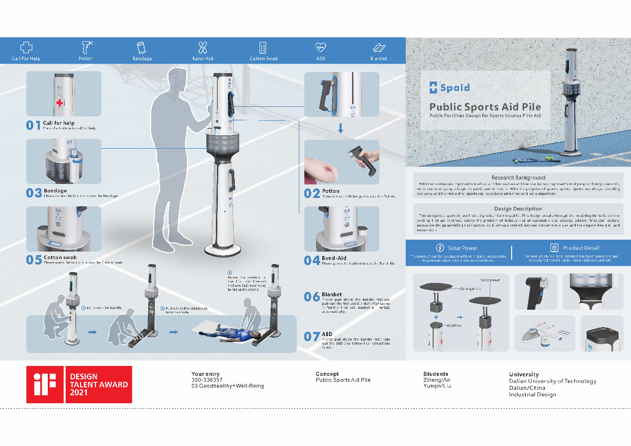 This year, the competition categories correspond to the Sustainable Development Goals of the United Nations, and the entry from DUT is closely related to one of the 15 themes: Good Health and Well-being. Due to the continuous improvement of social infrastructure and rising standards of living, more and more people are engaging in sports. However, that also means that the need for first aid for sports injuries is greater than ever. The entry Public Sports Aid Pileby the team of An Ziheng and Liu Yueqin designed a sports injury first aid pile, which can ensure that a variety of first aid equipment – from bandages to blankets – are easily at hand when needed. This design is modular, its functionality refined, it is convenient to use, and the stylish shape means it will not look out of place in a gym or other sports facility. It provides a new idea for the first aid design of sports injuries and is in line with the theme of "Good Health and Well-Being".