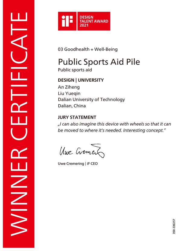 Recently, the winners of the 2021 iF Design Award were revealed. Public Sports Aid Pile, an undergraduate design by An Ziheng and Liu Yueqin, supervised by Associate Prof. Zhang Lu from the Department of Industrial Design of School of Architecture and Fine Art, Dalian University of Technology (DUT), was selected among more than 10,000 entries from dozens of countries worldwide and won the iF Design Talent Award 2021.
