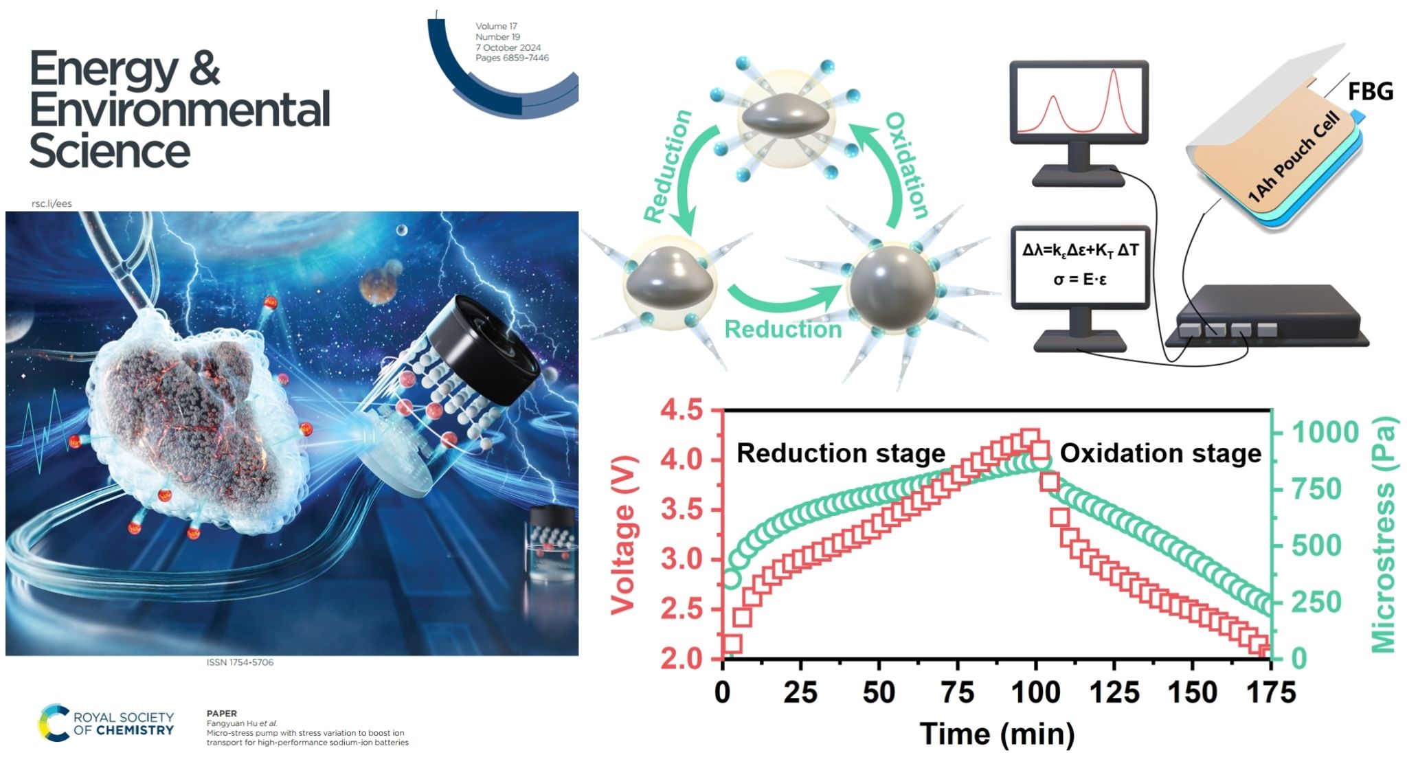 Recently, Prof. Fangyuan Hu of the School of Materials Science and Engineering has made progress in the creation of key materials for sodium-ion batteries, revealing the constitutive relationship between the electrode potential-induced interfacial tension changes in liquid metals, elucidating the new mechanism of micro-stress field to boost Na+ transport, and constructing a new type of high-performance electrochemical energy storage device. The research result is titled “Micro-stress pump with stress variation to boost ion transport for high-performance sodium-ion batteries” (sodium-ion batteries). The research result, titled “Micro-stress pump with stress variation to boost ion transport for high-performance sodium-ion batteries”, was published in Energy & Environmental Science (Impact Factor: 32.4), the top journal in the field of materials, and was selected as the cover paper of the current issue.