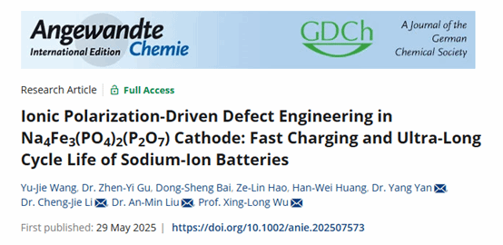 The above research has been published with the title of “Ionic Polarization-Driven Defect Engineering in Na4Fe3(PO4)2(P2O7) Cathode: Fast Charging and Ultra-Long Cycle Life of Sodium-Ion Batteries” in Angewandte Chemie International Edition.