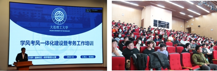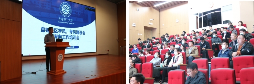 最后由教学事务办公室综合管理科科长杨浩铭进行学风考风一体化建设暨考务工作培训,对《大连理工大学考场规则》《大连理工大学违纪处分规定》进行了逐条阐释,对校区考风建设现状进行了总结,向师生介绍了校区监考辅助技术的发展情况,并通过详实的案例,介绍了16起典型的违纪案例。