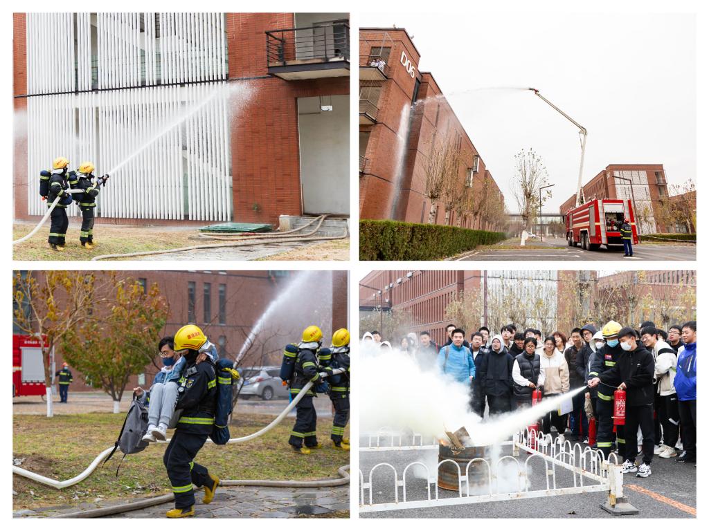 第二部分为室外消防应急救援演练及灭火器实操培训,在室外火灾现场救援模拟活动中,消防官兵完整展示了消防车出警、现场询情、战术制定、行动展开、消灭火情、人员救援、现场检查等环节,让同学们真切感受了一次“中国消防”的作战力量。