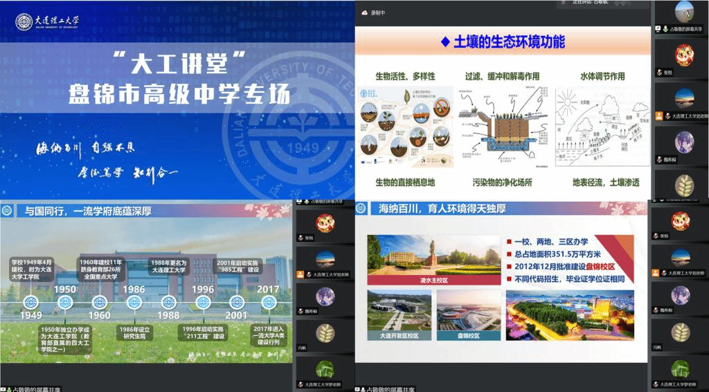 为更好践行高校服务地方的使命,吸引更多优秀生源,方便学生及家长了解学校情况、提供招生信息获取渠道,5月7日下午,盘锦市招生宣传工作组特邀大连理工大学校长助理兼盘锦校区党工委书记、管委会主任占敬敬教授,以线上会议的形式,为盘锦市高级中学的学生及家长开展题为“健康土壤带来健康生活”的大工讲堂。本次报告由学校盘锦市招生宣传工作组组长罗利主持,生命科学与药学学院承办,200余位学生及家长参加会议。
