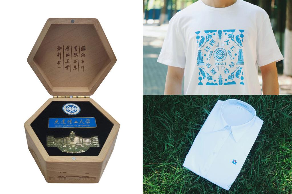 专属的定制毕业礼物,承载着学校对2021届毕业生的祝福与期待。校徽音乐盒通过六角形实木的设计,将熟悉的大工校歌融入其中,配以大工精神,希望毕业生牢记母校的教诲。其中的主楼校徽、蓝白圆形校徽和刻有毕业生名字和学号的大工校徽是母校馈赠给每一位毕业生的专属认证。毕业白衬衫和文化衫上通过心思精巧的设计蕴含着母校对毕业生们的牵挂和祝福,亦浓缩着母校独特深沉的爱,让自强不息的大工精神深深烙印在毕业生心中。