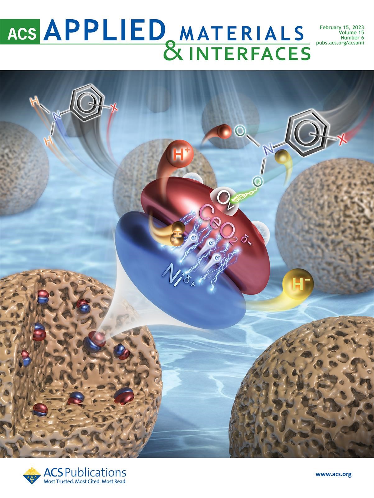 卤代芳胺类化合物被广泛用于有机化学、材料化学、药物化学等领域,是合成染料、杀虫剂和除草剂等一系列化学品的重要中间体,一般通过卤代硝基芳烃加氢制得。然而含有卤素(Cl、Br和I)基团的硝基芳烃在加氢过程中极易发生脱卤副反应。课题组基于前期对超小Ni-ZnO协同纳米催化剂的研究(ACS Appl. Mater. Interfaces2020, 12, 19581),设计合成了富含氧空位的Ni-CeO2异质结纳米催化剂,一方面利用Ni-CeO2界面产生的内建电场异裂活化氢气,提高了催化剂的活性,一方面利用氧空位对硝基的优先吸附抑制了碳卤键的吸附活化,提高了催化剂的选择性。该催化剂即使对最易离去的碘代物,选择性也达到90%以上。该成果近期发表于ACS Appl. Mater. Interfaces2023, 15, 8149并被编辑选为封面文章重点报道。