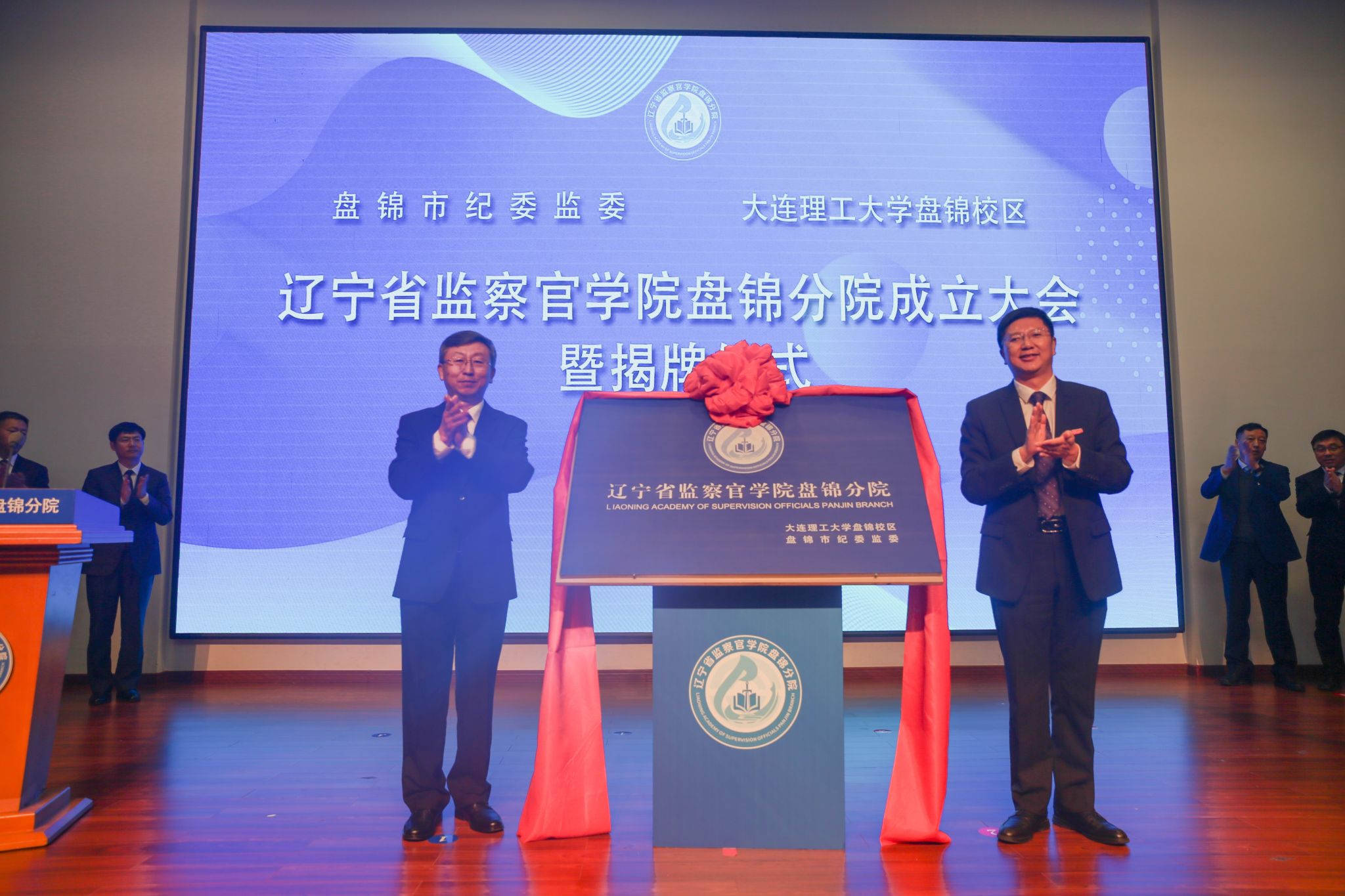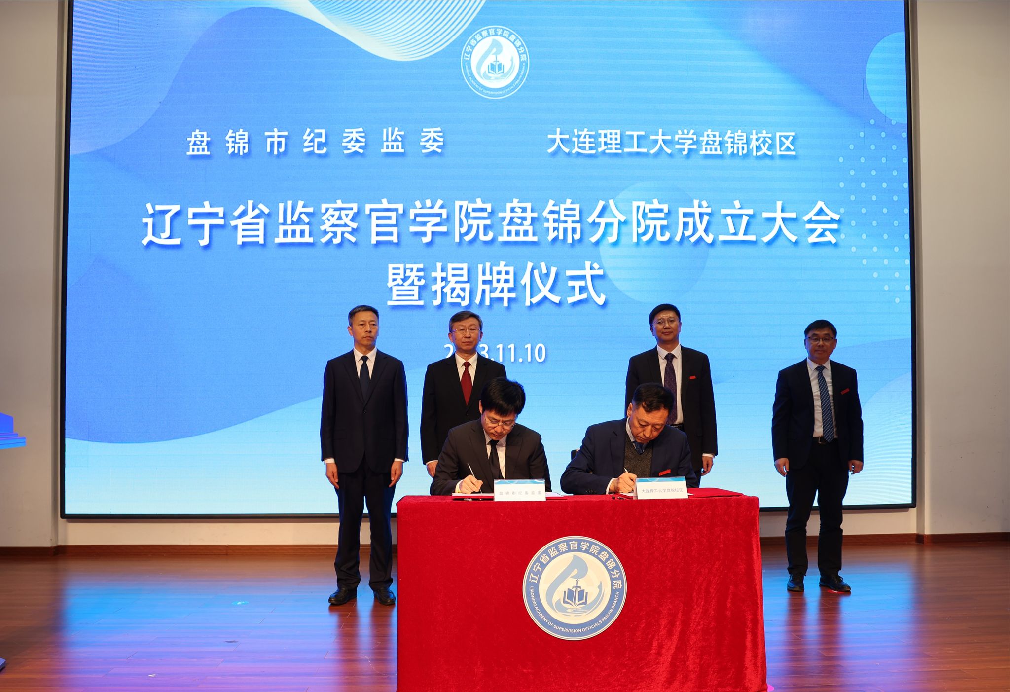 盘锦市纪委副书记、市监委副主任伏锦程宣读《关于成立辽宁省监察官学院盘锦分院的决定》;盘锦校区党工委副书记、纪工委书记田守智与盘锦市纪委分管日常工作的副书记、市监委副主任王本星代表校委双方签订《盘锦市纪委监委 大连理工大学盘锦校区共建辽宁省监察官学院盘锦分院战略合作框架协议》;占敬敬与曲维东共同为“辽宁省监察官学院盘锦分院”揭牌并致辞。