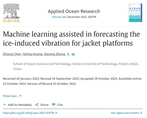 10月19日,海洋科学与技术学院2019级本科生、现复旦大学航空航天系航空宇航科学与技术专业硕士陈陟昂作为第一作者论文“Machine learning assisted in forecasting the ice-induced vibration for jacket platforms”被《Applied Ocean Research》接收。文章于2023年1月20日投稿,以大连理工大学为唯一署名单位,指导教师为张大勇教授。