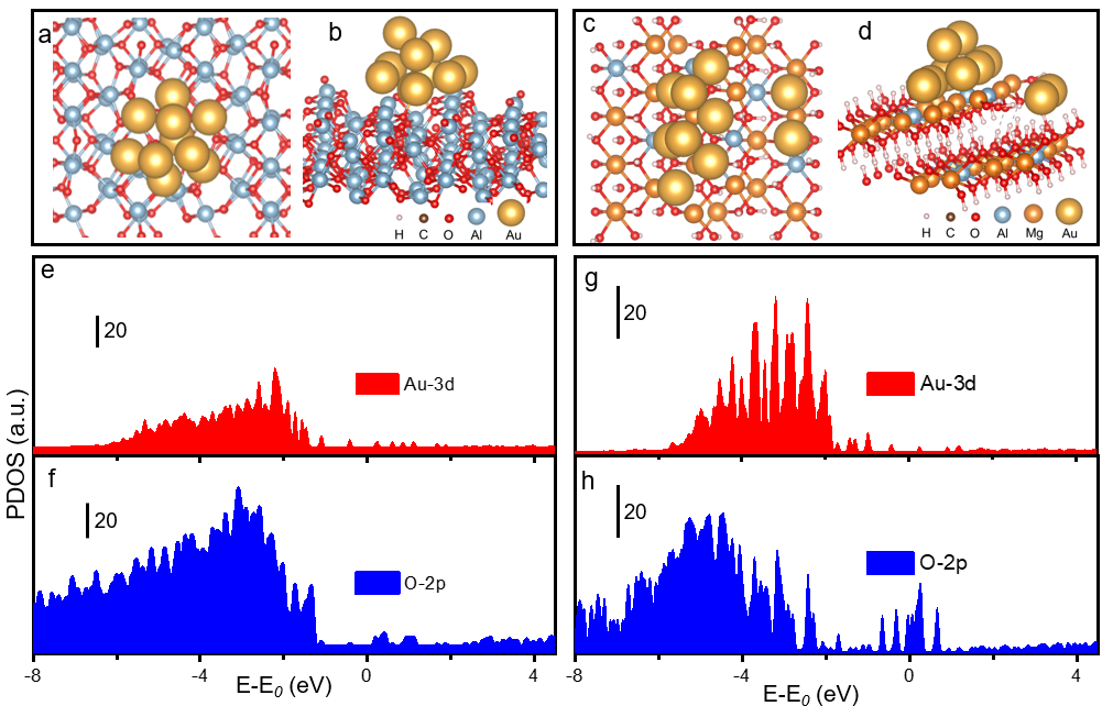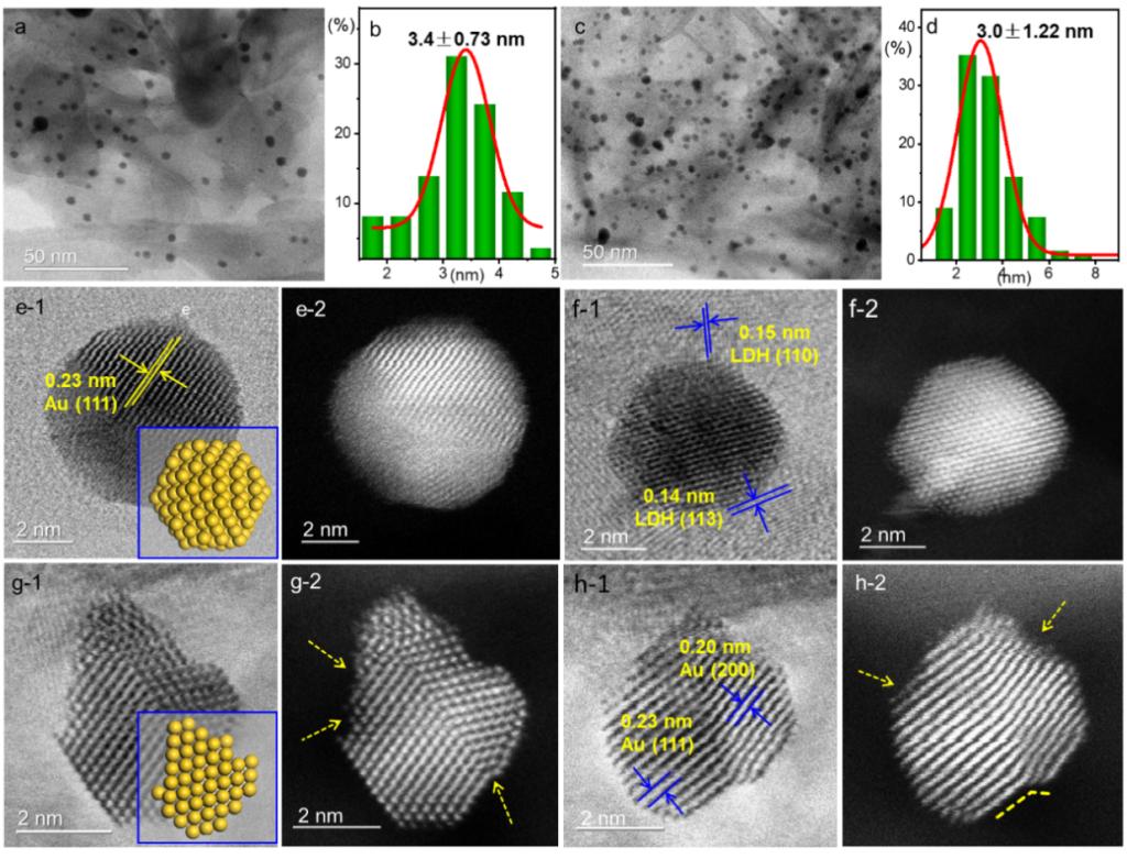 研究结果表明,基于层状双氢氧化合物MgxAl-LDH(水滑石)载体,调控Mg/Al原子比例,可实现MgxAl-LDH (015)晶面的优势生长。由于MgxAl-LDH(015)和Au(111)晶面间存在特殊的晶格匹配现象(匹配度> 98%),Au原子更易于在LDH(015)晶面发生迁移和重排。当Mg/Al比为3.0–3.5时,LDH与Au颗粒强相互作用,导致Au原子在晶格应力的作用下沿载体铺展,低配位Au原子在表面富集并形成缺陷型金颗粒。