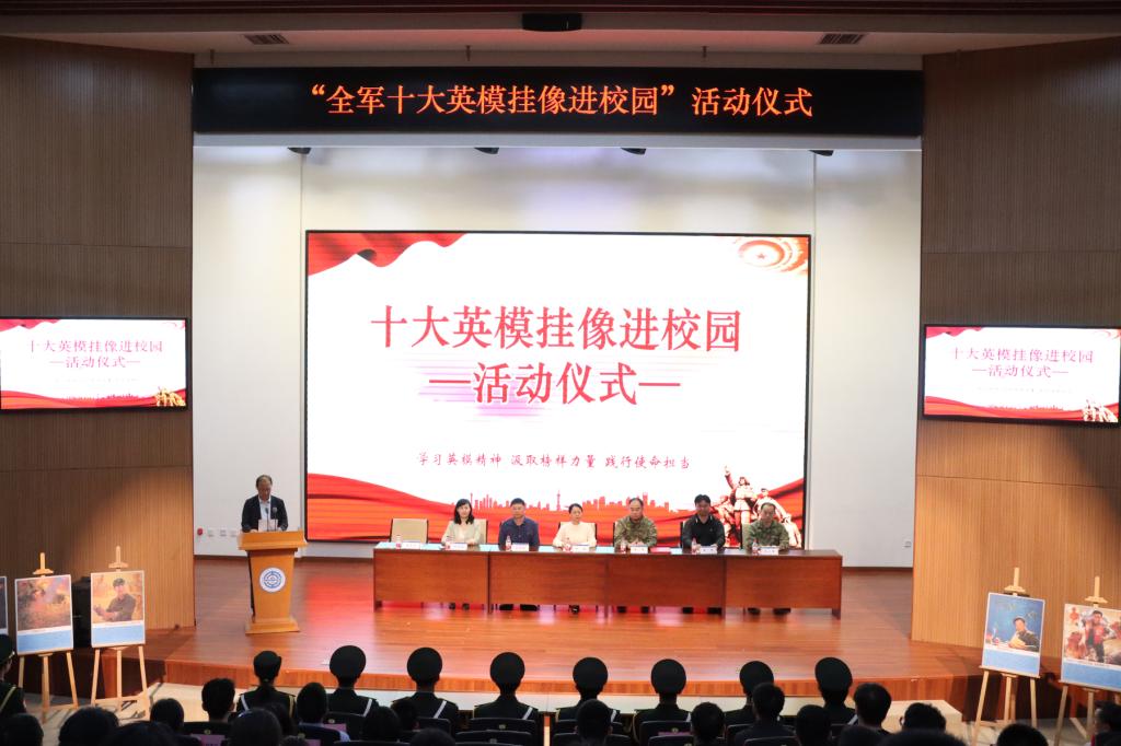 上午9时30分,校区E03报告厅内,在庄严的气氛中,参会领导将由军委政治工作部统一印制的张思德、董存瑞、黄继光、邱少云、雷锋、苏宁、李向群、杨业功、林俊德、张超十位英模挂像,郑重地交到了参会的校区国旗护卫队队员手中,全场响起热烈掌声。活动现场,同学们高喊“奋斗青春,国防有我”,用慷慨激昂的口号表达了当代青年砥砺强国之志、实践报国之行的决心。