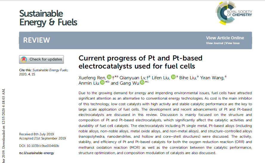 海洋科学与技术学院环境治理与资源化技术团队于2020年在Sustainable Energy & Fuels期刊(IF=6.813)发表的综述论文《Current progress of Pt and Pt-based electrocatalysts used for fuel cells》连续3年进入ESI高被引论文行列,被Chemical Reviews、Chemical Society Reviews、Nature Communications、Advanced Materials、Electrochemical Energy Reviews、Applied Catalysis B-Environmental、Advanced Functional Materials、Angewandte Chemie-International Edition、ACS catalysis等行业内顶尖杂志引用,目前引用频次为268次。通讯作者任雪峰副教授被评为RSC英国皇家化学会2021年“Top 1%高被引中国作者”。