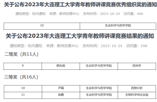 在2023年10月18日举行的大连理工大学2023年青年教师讲课竞赛中,生命科学与药学学院郭兆明荣获二等奖,尹磊、赵静荣获三等奖,学院荣获讲课竞赛优秀组织奖。