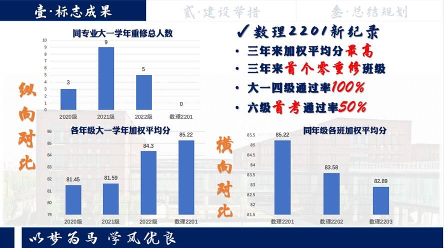 数理2201班经过大一一年的刻苦努力,班级以85.22的均分位列专业第一,年级成绩前5名中占据4席,双双突破数理专业往年记录;实现英语四级通过率100%,六级首考通过率50%,刷新学院大一六级首考通过率记录。班级内同学共获国家奖学金1人次,学习优秀奖学金9人次,单项奖学金12人次;在科创活动中,班级同学参与国家级大学生创新创业训练计划一项,获得“互联网+”校级一等奖,APMCM亚太地区大学生数学建模竞赛二等奖等。