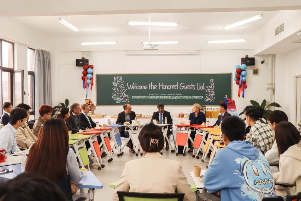 参观后,尼山·卡纳戈瑞迦校长在C07-301智慧教室与莱斯特国际学院30余名学生代表座谈交流。同学们提出了他们在学习和未来发展等方面的困惑,尼山·卡纳戈瑞迦校长分享了自己的经验和看法。交流中,同学们的英语表达能力与科研素养给他留下了深刻的印象。