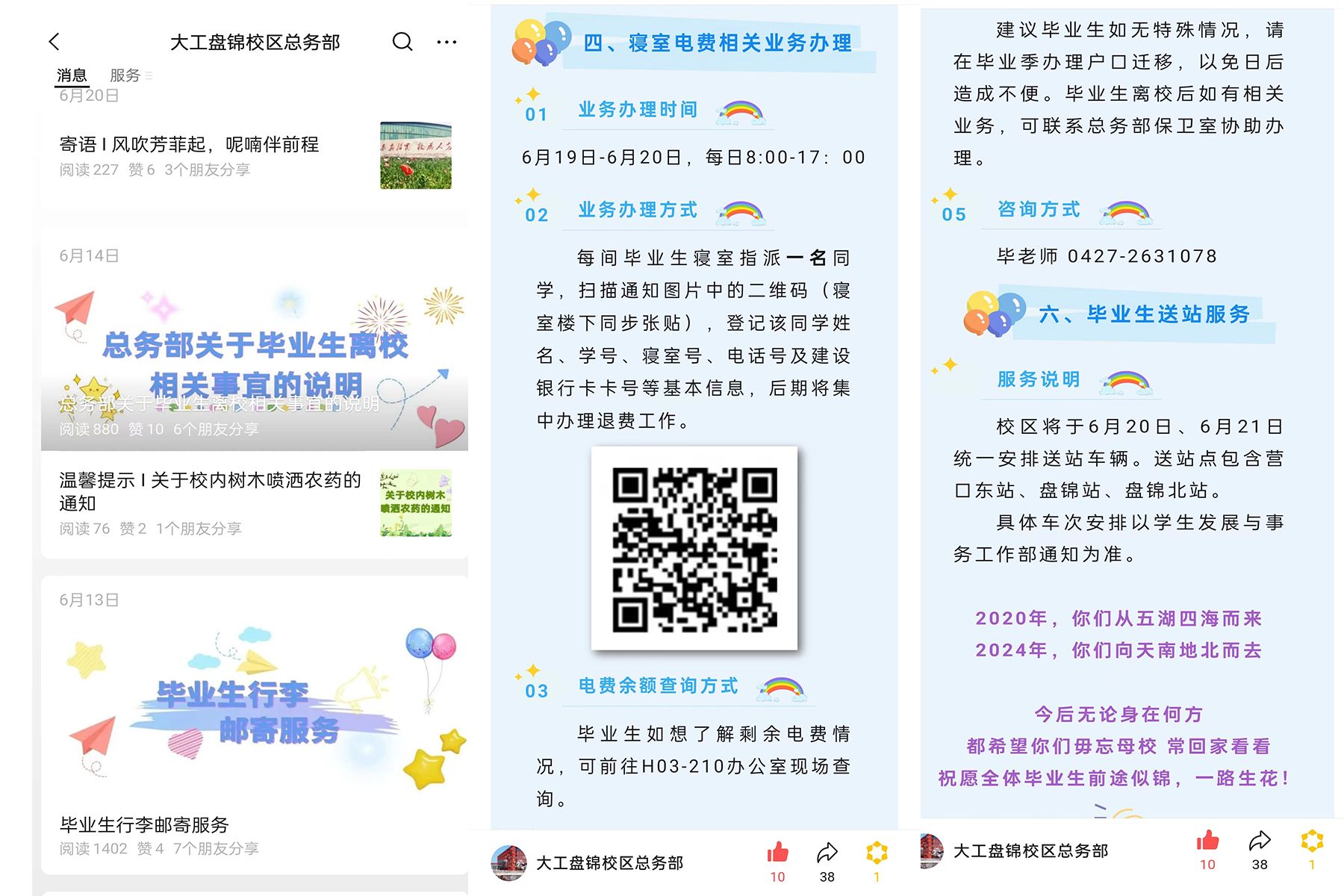 在校区发布毕业生离校工作安排通知的基础上,总务部将涉及部门相关业务进行梳理,并对业务内容、办理时间、地点、所需材料、咨询方式等信息进行详细说明,通过微信公众号、部门网站等形式广泛进行宣传指引,力争让每一名毕业生都能清晰掌握离校报退业务该如何办理。