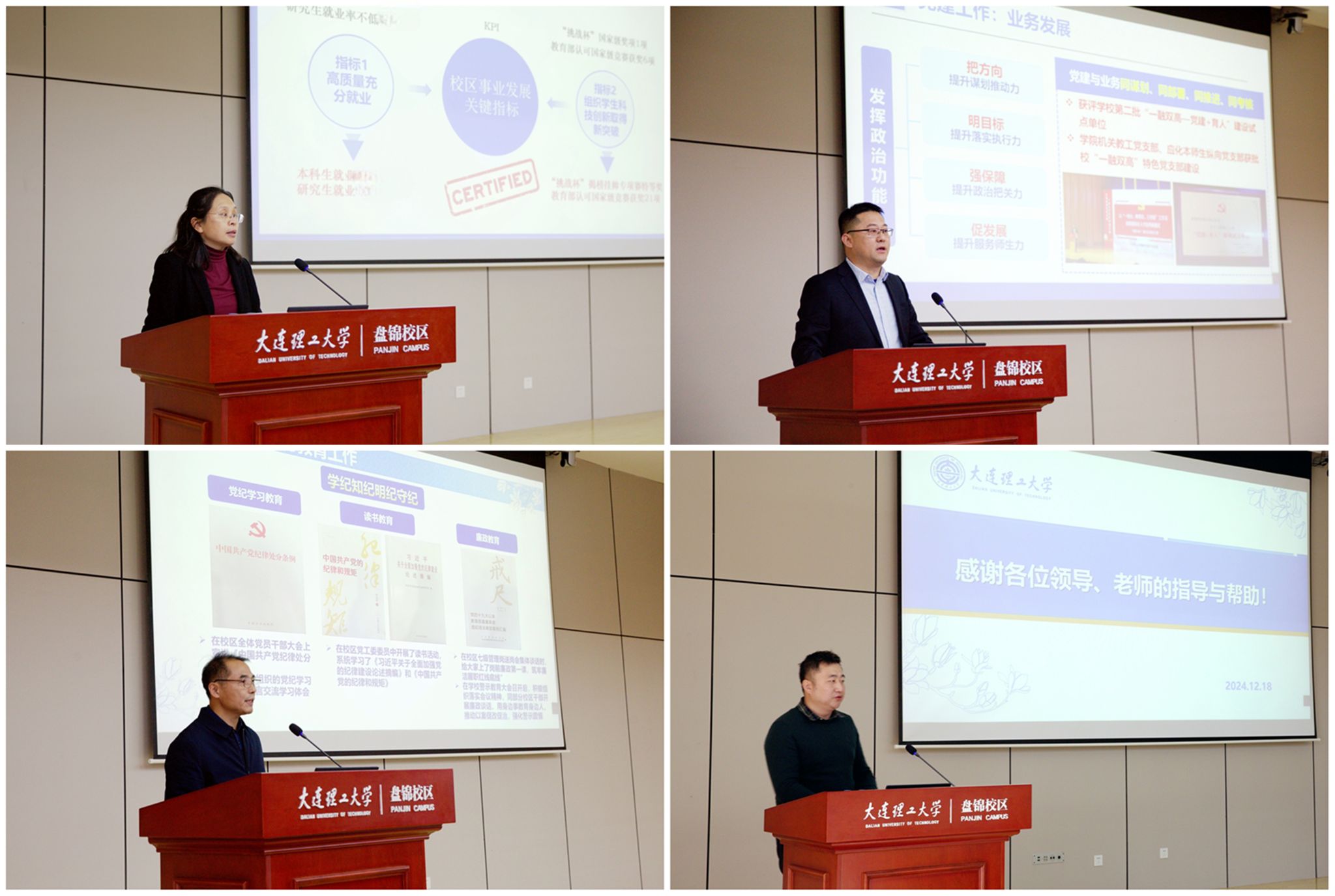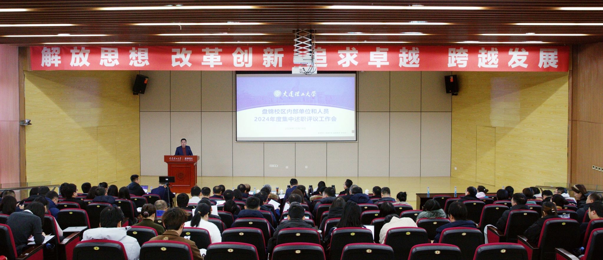 12月18日,盘锦校区在行政服务楼报告厅召开2024年度内部单位和个人集中述职评议大会。校党委常委、副校长兼盘锦校区党工委书记罗钟铉出席会议并讲话,校长助理兼盘锦校区管委会主任占敬敬主持会议。校区领导班子成员、处级干部、七级管理岗位人员和教师代表参加会议。