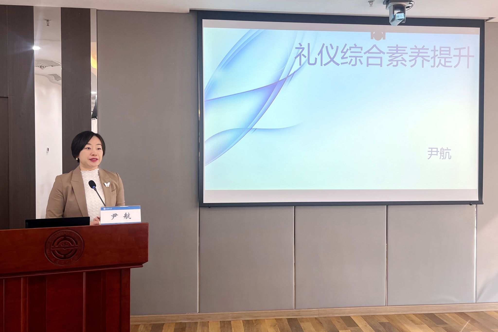 尹航老师围绕“教师形象礼仪”“日常接待礼仪”与“国际商务礼仪”等方面,系统梳理了从个人形象管理、言谈举止规范到涉外交往惯例等一系列实用知识与技巧。培训过程中,尹航老师不仅注重理论知识的传授,更强调实践应用能力的培养。她结合大量真实案例,生动演示了在不同工作情境中如何有效展现礼仪素养。培训现场互动频繁,参加培训的干部教师积极与尹航老师互动,深入交流了各项礼仪的注意事项、常见误区及应对策略。
