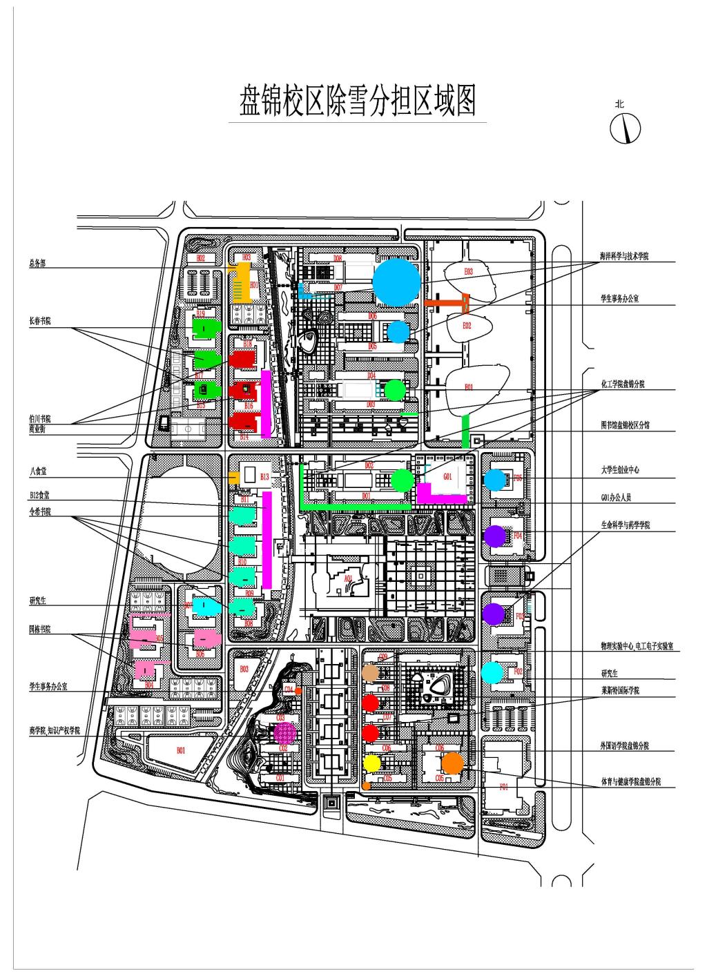 物业负责校区内主干路黑色路面除雪工作;各单位负责本部门楼前的庭院、人行步道及方砖通道除雪工作。如对分担区不明确尽快与总务部联系(详见:盘锦校区除雪分担区域图)。