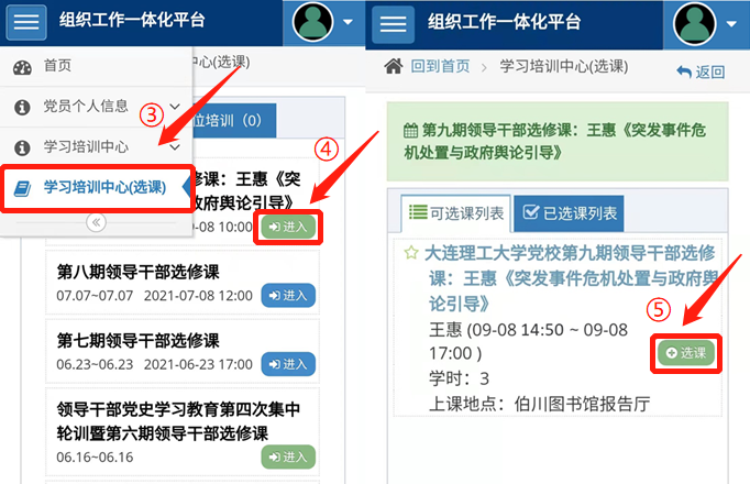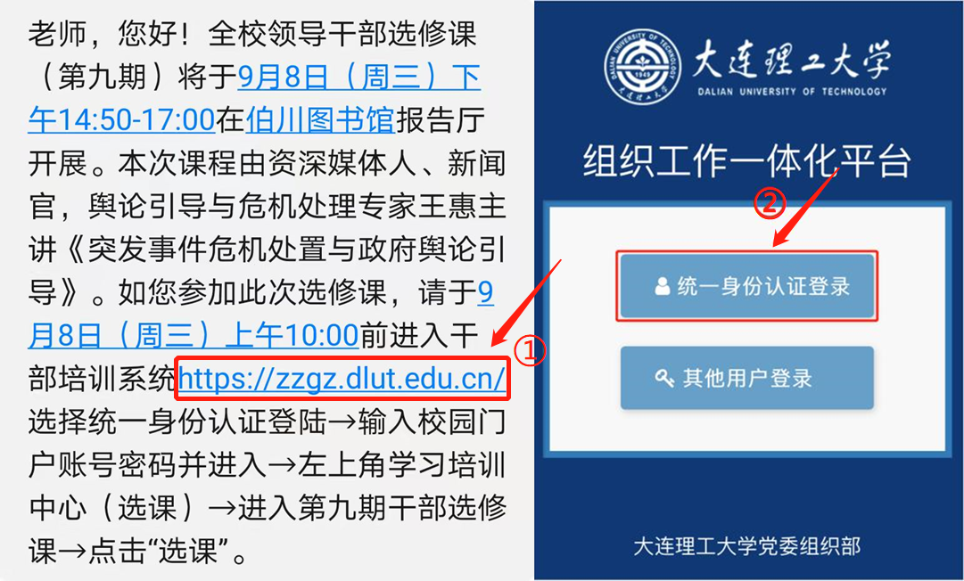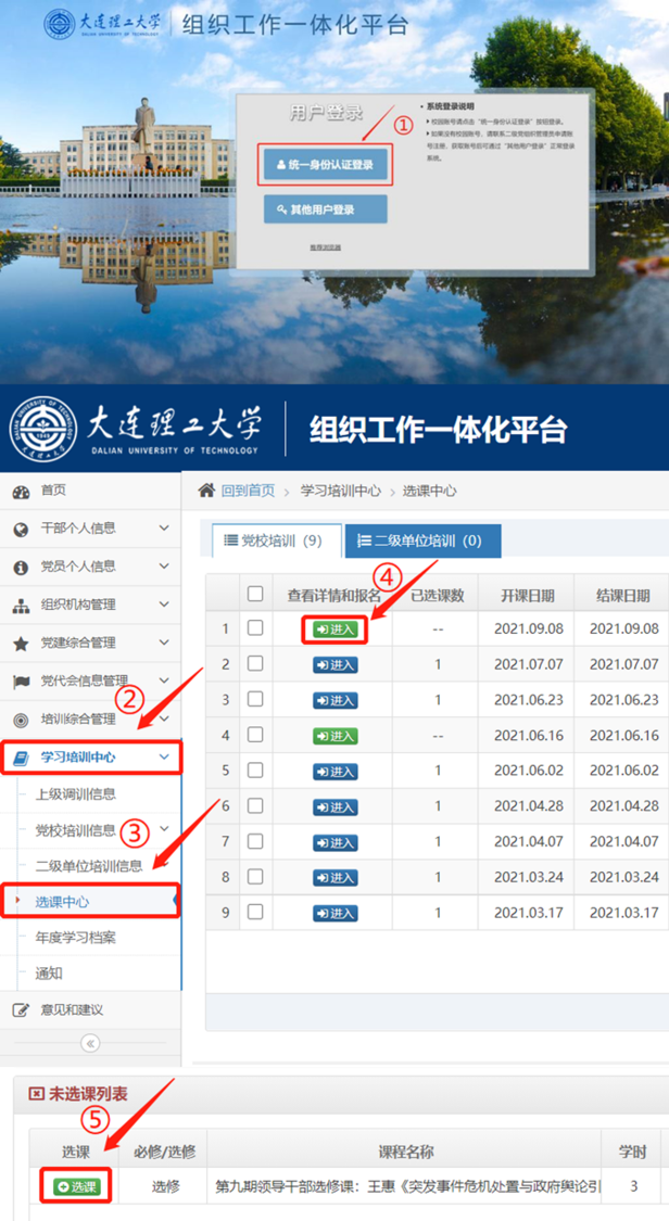 ①请查收手机中的参会短信,点击短信中干部培训系统链接→②选择统一身份认证登录,输入校园门户账号密码并进入→③左上角学习培训中心(选课)→④进入第九期干部选修课→⑤点击“选课”。