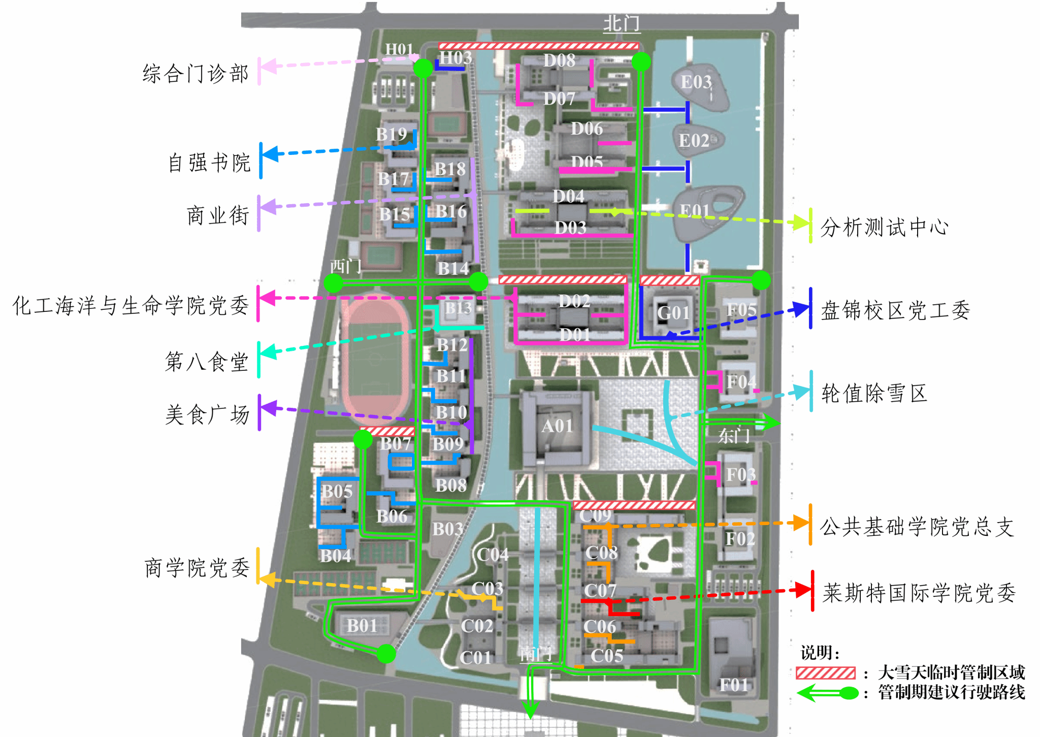 如遇大雪等极端天气状况,校区将对部分路段实施交通管制(C09、G01、D02、D08、B07北侧路段),禁止机动车驶入,以免车辆碾压形成雪楞、冰包,造成交通安全隐患。待管制路段积雪清理完毕后,将及时取消交通管制。具体交通管制区域及通行建议,详见附图。