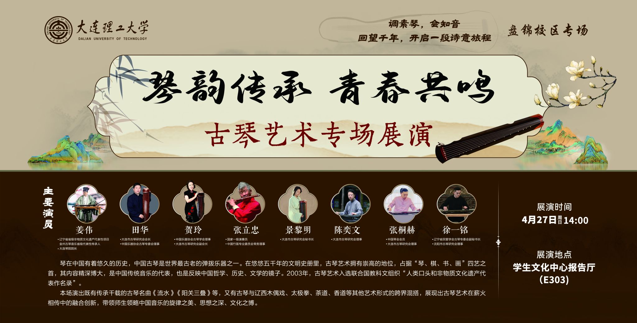 本场演出既有传承千载的古琴名曲《流水》《阳关三叠》等,又有古琴与辽西木偶戏、太极拳、茶道、香道等其他艺术形式的跨界混搭,展现出古琴艺术在薪火相传中的融合创新,带领师生领略中国音乐的旋律之美、思想之深、文化之博。