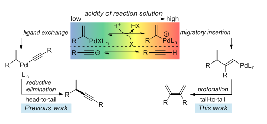 基于实验研究和理论计算结果作者发现,在较强的酸性体系下,中性的烯基钯中间体可以转化为相应的阳离子烯基钯中间体,而端炔难以解离成炔基负离子。此时,烯基钯物种难以发生配体交换反应,而易与另一分子端炔发生迁移插入反应,从而促进2,3-二取代-1,3-丁二烯化合物的生成。“选择性分子转换和官能化”研究团队长期致力于炔烃化学的研究,并已取得系列创新成果。该研究工作揭示了烯基钯物种与端炔的反应规律,为实现高选择性的钯催化炔烃转化提供了新的思路。