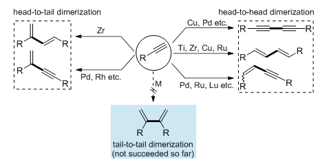 在过渡金属催化或介导下,通过端炔的首-首二聚和首-尾二聚反应,已经成功合成了共轭二炔、二烯和烯炔化合物。然而,通过端炔的尾-尾二聚反应合成2,3-二取代-1,3-丁二烯化合物,迄今为止未见报道。相较于已报到的合成方法,通过端炔的尾-尾二聚反应合成2,3-二取代-1,3-丁二烯化合物,具有步骤经济的优点。