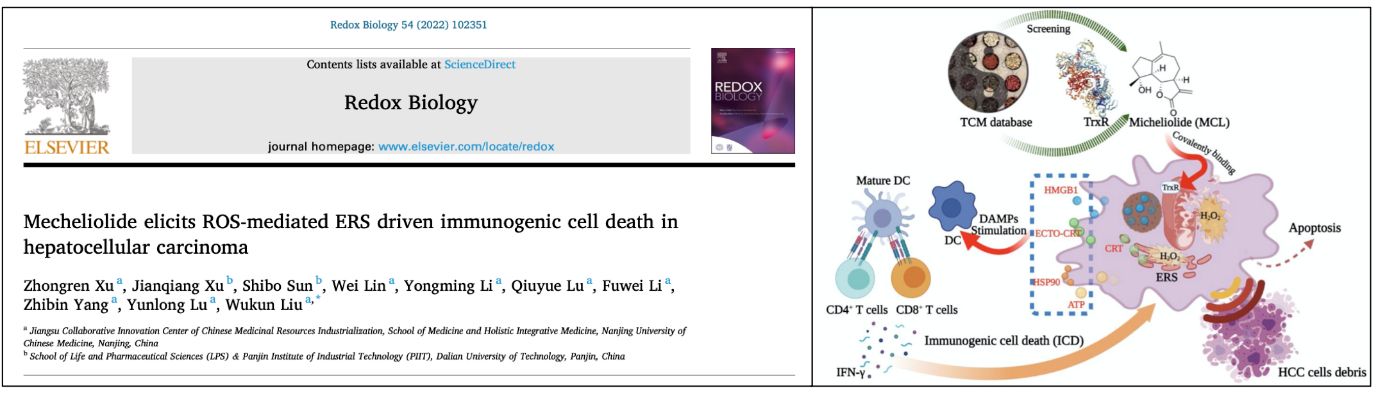 MCL能与TrxR表面暴露的活性位点Sec498发生不可逆共价结合,选择性抑制肝癌细胞中的TrxR活性,刺激ROS水平激增,破坏肝癌细胞氧化还原内稳态,诱导发生内质网应激(Endoplasmic Reticulum stress,ER stress),进一步促进DAMPs的释放,引起肝癌细胞免疫原性细胞死亡(Immunogenic Cell Death,ICD)。相关成果题为“Mecheliolide elicits ROS-mediated ERS driven immunogenic cell death in hepatocellular carcinoma”,于2022年5月发表在国际知名学术期刊Redox Biology (中国科学院生物一区,TOP期刊,IF=11.4),生命科学与药学学院许建强副教授为第二作者、研究助理孙世博为第三作者。