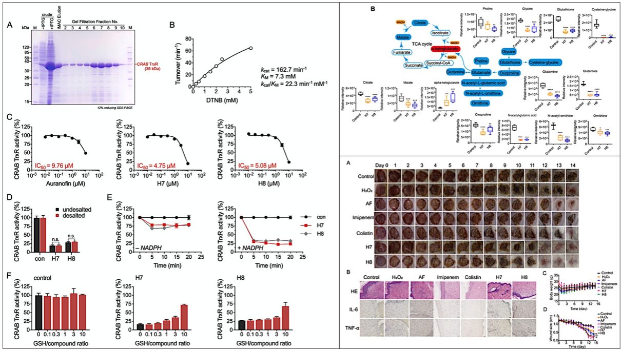 近期,许建强课题组与南京中医药大学医学院•整合医学学院麻彤辉教授、刘武昆教授团队开展合作研究,设计合成了一系列卡宾硒金化合物,对多重耐药革兰氏阴性菌呈现显著抗菌活性。该研究详细探讨了活性金化合物靶向TrxR的氧化还原活性基序,从而不可逆地抑制细菌TrxR活性,最终导致氧化应激,引起细菌死亡。结合代谢组学、动物模型等,研究揭示卡宾硒金化合物诱发CRAB结构与功能紊乱,从而发挥其抗菌活性。