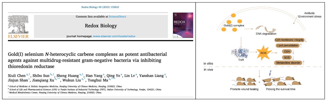 该项合作研究通过设计合成具有良好抗菌活性的新型卡宾硒金衍生物并深入探讨其作用机制,为抗革兰氏阴性超级耐药菌的药物研发提供了新思路。相关成果于2023年2月发表在国际知名学术期刊Redox Biology(中国科学院生物一区,TOP期刊,IF=11.4),属于金化合物抗多重耐药菌活性与作用机制最新研究成果,论文题为“Gold(I) selenium N-heterocyclic carbene complexes as potent antibacterial agents against multidrug-resistant gram-negative bacteria via inhibiting thioredoxin reductase”, 生命科学与药学学院许建强副教授为论文共同通讯作者、研究助理孙世博为共同第一作者。