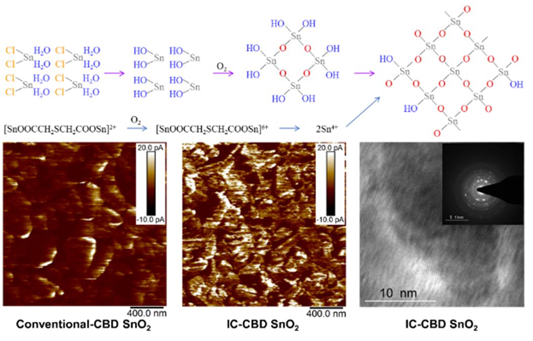 目前,SnO2已取代TiO2,成为钙钛矿太阳能电池(PSCs)最具潜力的电子传输层(ETLs)材料。但SnO2ETLs制备的高温后退火过程会导致界面的不完全覆盖以及氧空位,从而形成电荷陷阱或复合中心,造成器件性能下降。同时高温工艺增加能耗,且与柔性基底不兼容。因此,本文通过改进化学浴沉积法(CBD),引入螯合剂与前驱体溶液形成中间体,在低温(90℃)及超低温(25℃)下,调控SnO2的成核和生长动力学,制备了超低温SnO2ETLs。与传统的方法比较,中间体控制制备的超低温SnO2ETLs具有更好的结晶,增强了光透光率及电导率。通过对中间体控制超低温SnO2ETLs复杂化学反应机理的深入了解,使基于中间体控制化学浴沉积(IC-CBD)SnO2ETLs的PSCs获得了23.17%的最高PCE,且稳定性得到大幅度提升。相关工作近日发表在ChemSusChem上。