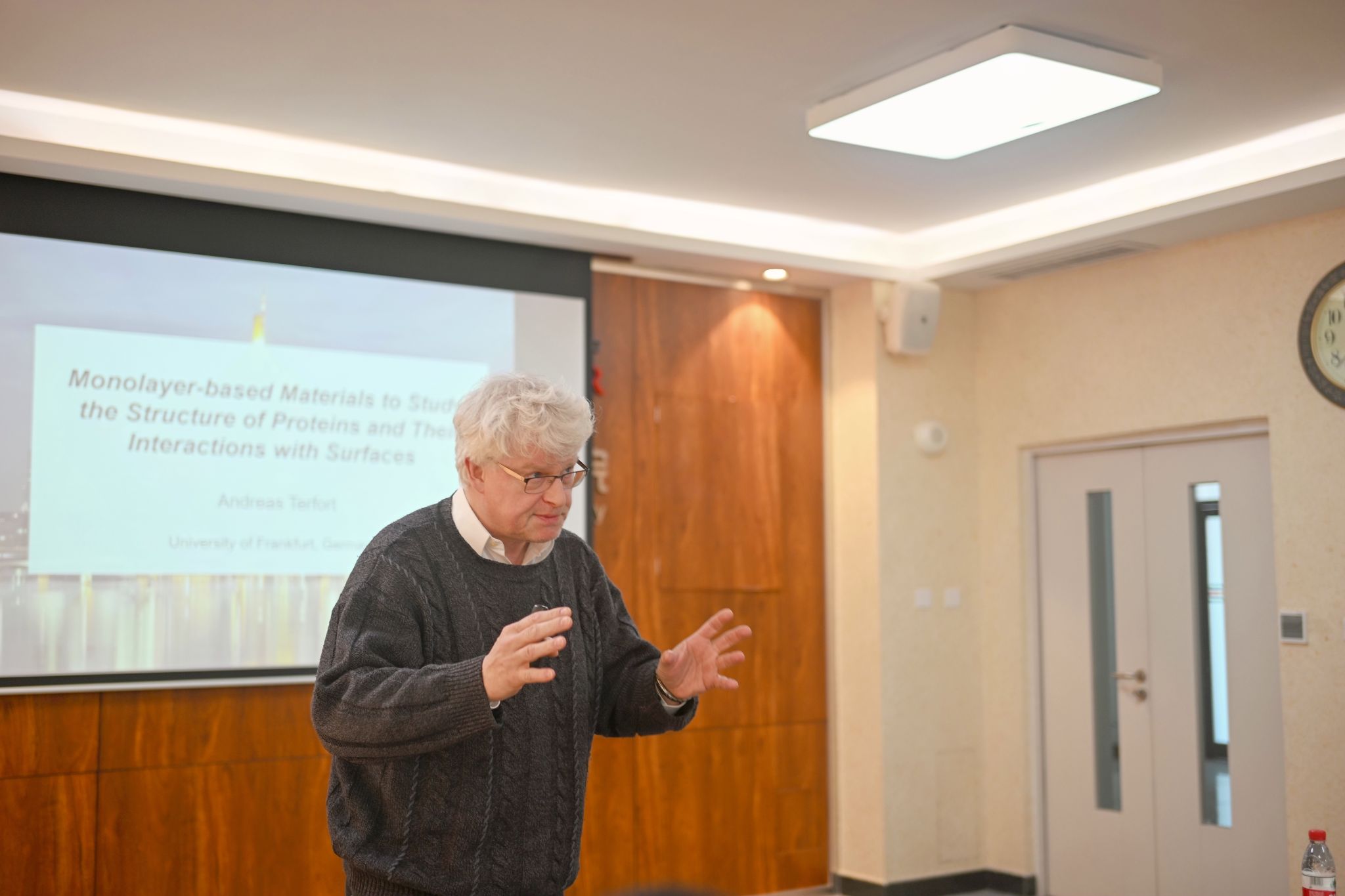 Andreas Terfort教授从日常生活现象入手,深入浅出地讲解了细菌如何利用菌毛附着于表面,以及科学家基于此原理开发针对细菌感染的新疗法。随后,Andreas Terfort教授展示了糖萼模型,详细介绍了糖萼在细胞粘附和通讯中的关键作用。此外,他还重点介绍了自组装单层膜(SAMs)这一创新工具在生物识别研究中的应用,通过SAMs的可切换系统,展示了科学家如何通过操纵表面生物相互作用,为表面结合分子的行为提供新的见解。