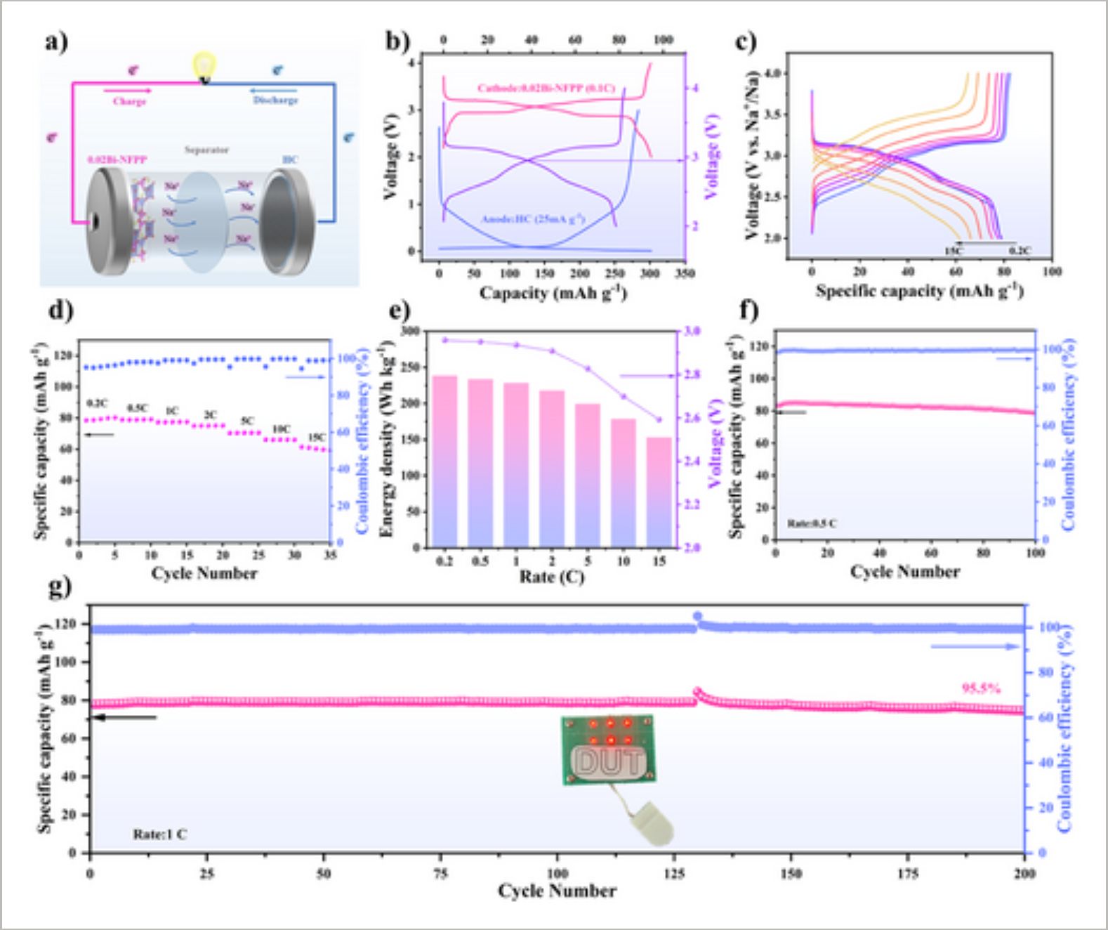 采用硬碳负极的全电池在1 C倍率下循环200次后容量保持率达95.5%。揭示了离子极化效应与晶格缺陷之间的协同作用机制,为设计兼具快速充放电能力和超长寿命的SIBs正极材料提供了一种新策略。全电池优异的电化学性能,使本研究的材料在未来钠离子电池(SIBs)的工业化应用中极具前景。