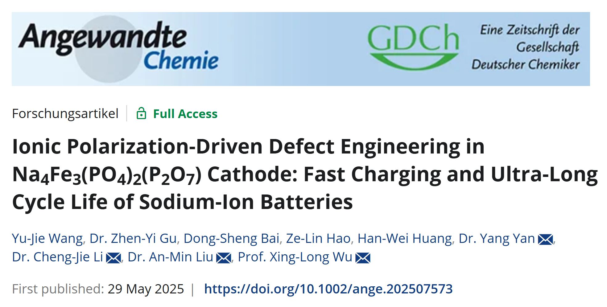 近日,该研究成果以“Ionic Polarization-Driven Defect Engineering in Na4Fe3(PO4)2(P2O7) Cathode: Fast Charging and Ultra-Long Cycle Life of Sodium-Ion Batteries”为题发表在国际知名期刊Angewandte Chemie International Edition上。化工海洋与生命学院硕士研究生王昱捷、东北师范大学谷振一为论文共同第一作者,颜洋、李成杰、刘安敏、吴兴隆为论文共同通讯作者。