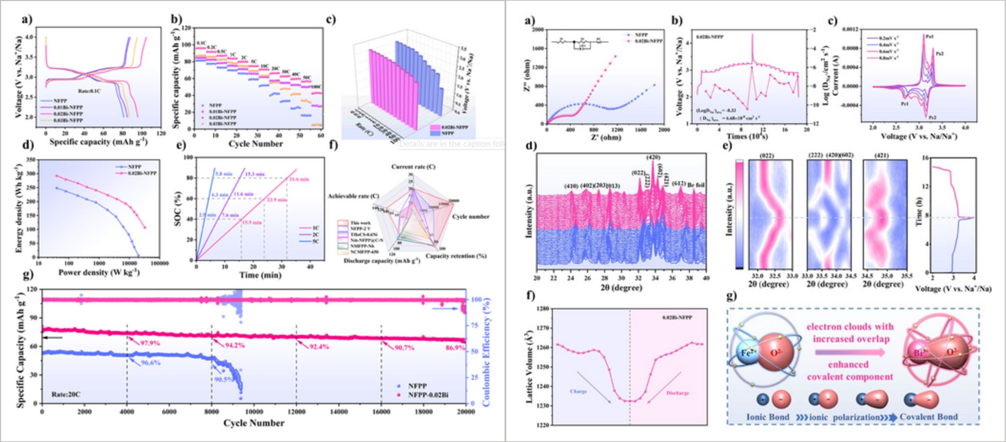 优化后的0.02Bi-NFPP正极表现出优异的电化学性能,纽扣电池在1 C倍率下仅需31.6分钟即可充电至80%;在20C倍率下循环20000次后,容量衰减率仅为每循环0.000495 mAhg-1(容量保持率达86.9%)。