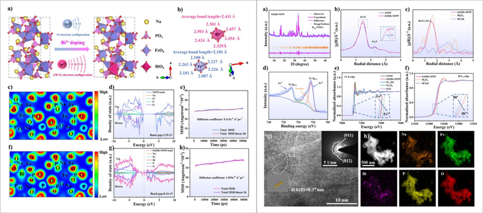 研究工作提出了一种离子极化驱动的缺陷工程策略,通过离子掺杂调控NFPP的电子结构和钠离子传输动力学。实验结果和理论计算表明,引入Bi3+掺杂,显著提高了NFPP的晶体结构稳定性,并优化了材料的带隙(从3.29eV降至0.16eV),引入晶格缺陷可以提供额外的钠存储位点。