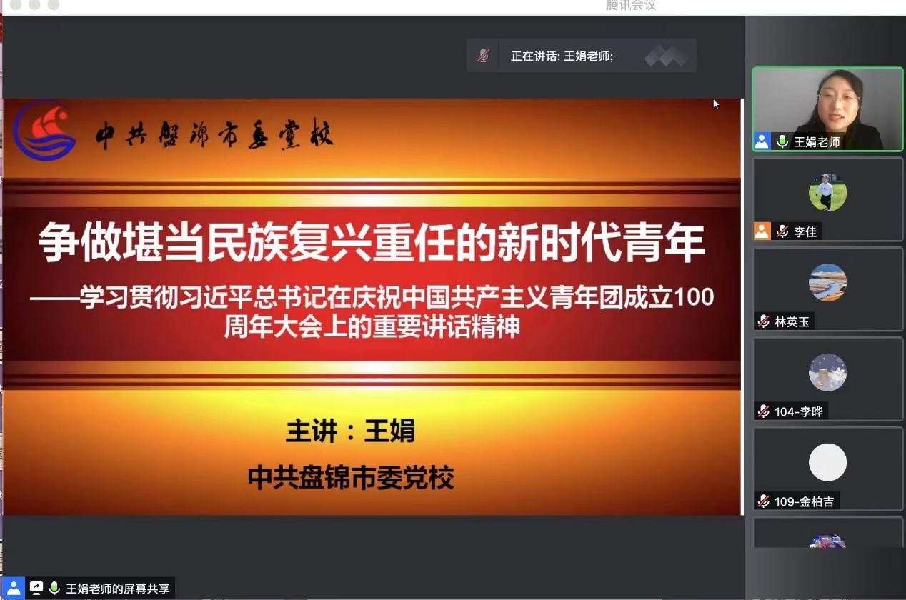 本次培训共设置四场专题报告。5月18日下午,盘锦市委党校王娟教授为学员做《争做堪当民族复兴重任的新时代青年》专题报告,带领学员们学习习近平总书记在庆祝中国共产主义青年团成立100周年大会上的重要讲话精神,倡导学员们牢记共产主义青年团光辉历程,把握新时代青年运动和青年工作原则,争做堪当民族复兴重任的时代先锋。