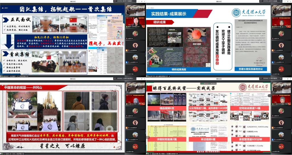 本次寒假社会实践共有“赓续红色基因”“致敬峥嵘岁月”“回访高中母校”“书写大工智慧”“青春服务基层”“逐梦时代企业”六个分主题,同学们学习党史、走访企业、乡村调研、志愿服务,用镜头和纸笔记录国情和社会,用知识和技能服务人民群众。“信仰行者”走访井冈山、瑞金和南昌的革命历史纪念馆,探寻红色故事,理解红色精神。“与化同行·巧农问道·赴寿寻光”实践团探究山东寿光蔬菜产业模式,用青春智慧助力乡村产业发展。“壹品印象·晋乡情徜”实践团深入采访太原、长治的扶贫工作者与村民,体悟乡村振兴战略的重要内涵。“商知同行·京滨留梦”实践团了解证券行业现状,提升专业认知,树立正确就业观念……