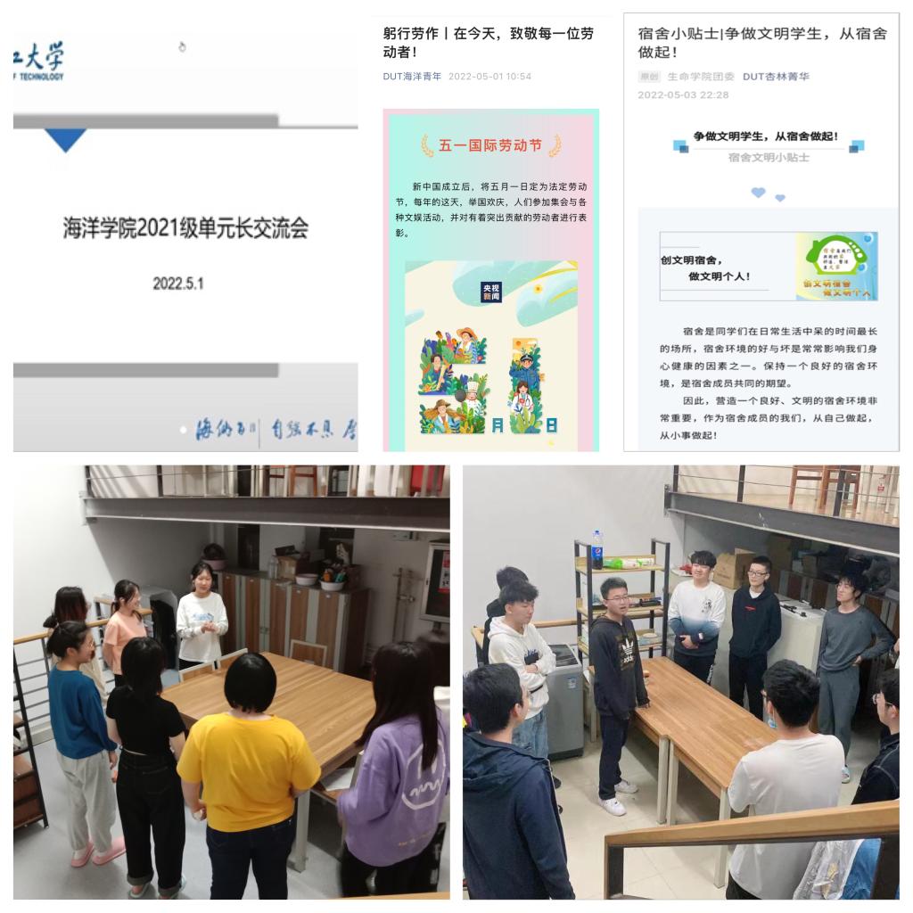 学生事务办公室发布《大连理工大学盘锦校区主题劳动教育实施方案》,积极组织动员各学院开展多维度的劳动教育活动。各学院积极响应,结合实际情况,开展了线上线下相结合的多形式的劳动教育系列活动。各学院百花齐放,充分调动广大学生的主动性和创新性,主动发挥学生党员、单元长、宿舍楼层长和楼长带头作用,通过评比奖优、趣味活动、晒照对比、云端参观等多种形式,把卫生清洁和疫情防控教育相结合、把宿舍整理和劳动习惯养成相结合,着力营造了“我的宿舍我爱护”的良好风气。通过微信公众号宣传,致敬每一位劳动者,增强学生对劳动价值的认同;开展单元长交流会,提升学生主人翁意识,激发学生自主参与劳动实践的动力;参观“标杆单元”,促进不同寝室之间学习交流,树标杆、学标杆、成标杆,鼓励学生向榜样看齐。