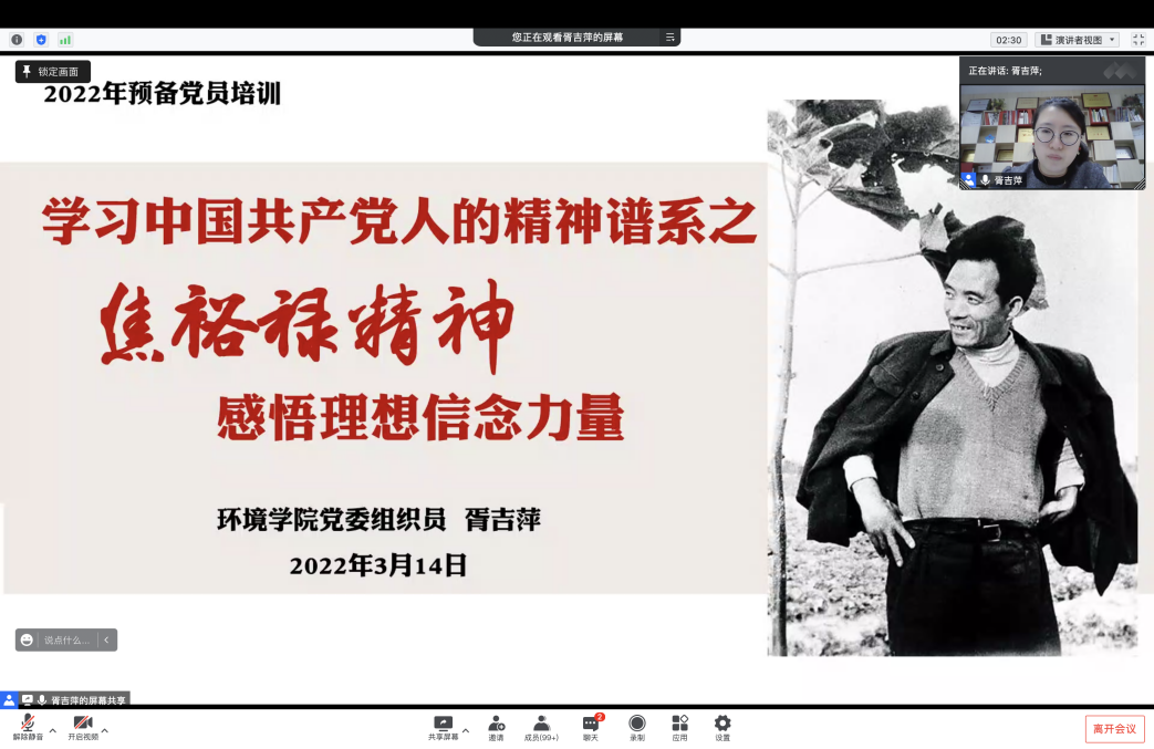 3月14日,环境学院党委组织员胥吉萍开展主题为《学习焦裕禄精神,做合格党员》的报告。她通过讲述焦裕禄同志的生平事迹,深刻展现焦裕禄精神的深刻内涵——“心中装着全人民,唯独没有自己”的公仆情怀;凡事探求就里的求实作风;敢教日月换新天的奋斗精神以及艰苦朴素、廉洁奉公的道德情操。引领学员们积极响应习近平总书记在兰考调研时所发出的学习焦裕禄精神的号召。
