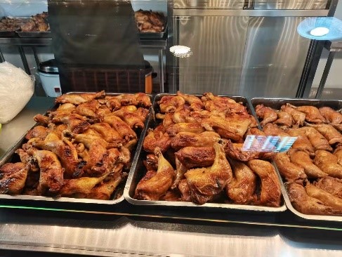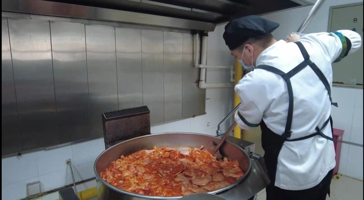 为给校区同学们提供色香味俱全的多口味鸡腿,食堂13家档口50余名工作人员齐心协力,在保证其他餐品正常供应的情况下,利用休息时间订货备货、清洗腌制、细心烹饪,历时2天制作出奥尔良鸡腿、炸鸡腿、香辣鸡腿、卤味鸡腿等各种口味。