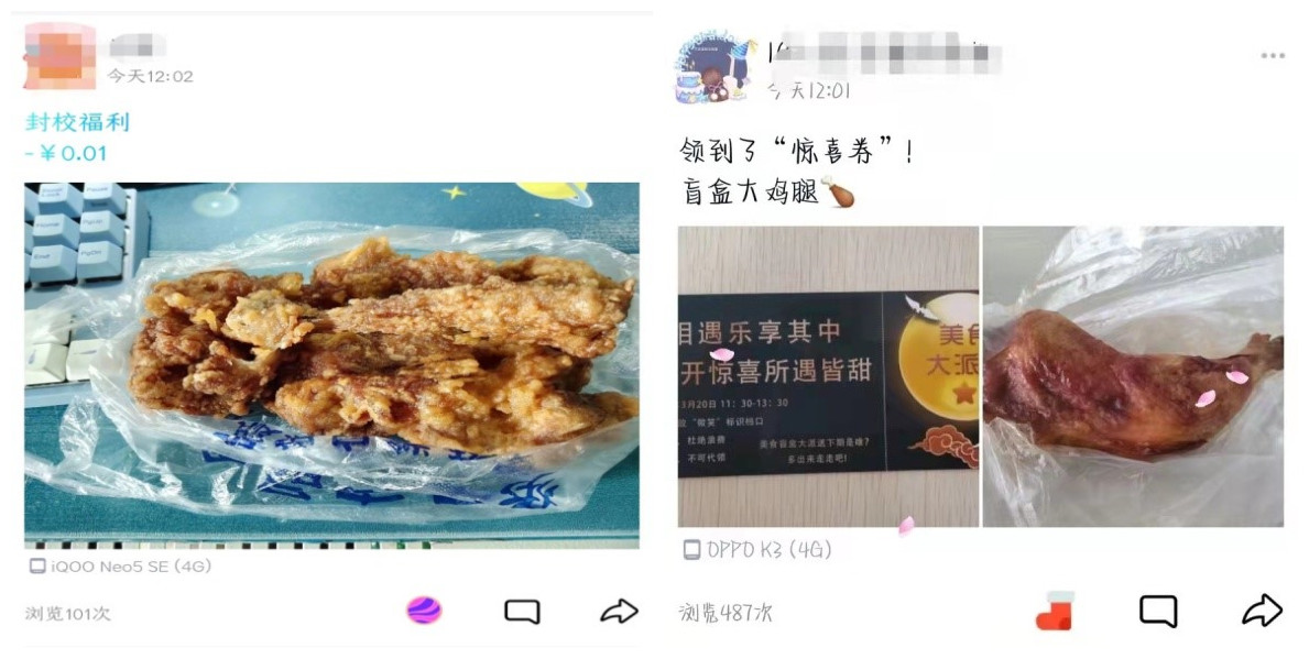 封校,不封情,暖心活动伴你行。3月20日,盘锦校区以“盒你相遇乐享其中盲开惊喜所遇皆甜”为主题开展“美食盲盒大派送”第一期活动,校区食堂为校区学子免费赠送1500只鸡腿,为同学们中午加餐加营养。