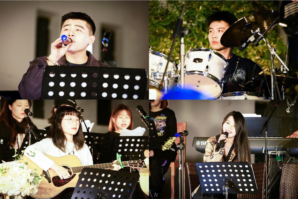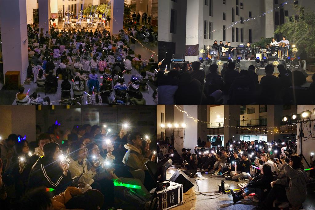 随着一段悠扬的钢琴声响起,音乐会的大幕徐徐拉开。跳动的鼓点、低沉的贝斯、娓娓动听的歌声与E02郁郁葱葱的竹林和灯光,配合着台下同学的荧光棒与闪光灯,共同组成了华美的乐章。