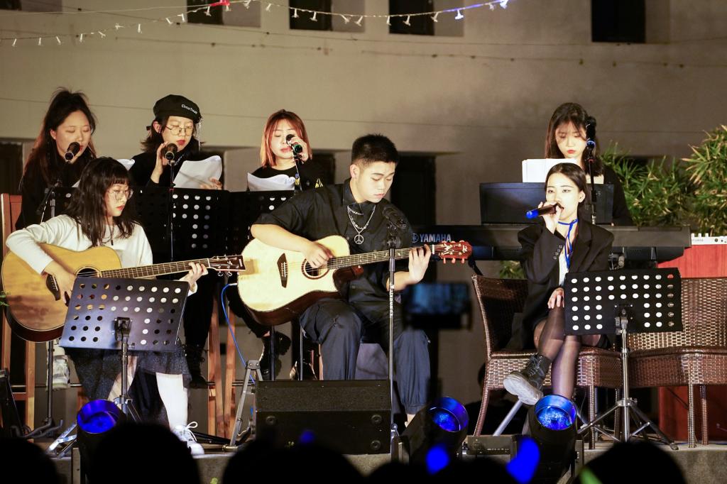音乐将一切平凡的画面赋予最深厚的意义,守护着同学们心中最纯净的领域。沙丁鱼乐队演绎的歌曲唱出了灵动飘逸的青春,台下的观众掌声与欢呼声不停,为精妙绝伦的表演喝彩。艺术团星韵工作室、合唱团的同学们也加入到演唱中,用动听悠扬的和声,让整个现场气氛变得放松惬意。