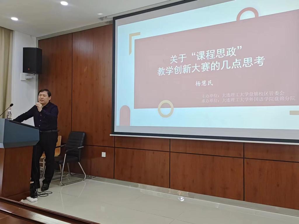 3月31日下午,《关于“课程思政”教学创新大赛的几点思考》讲座在C05-201会议室顺利召开,该讲座由大连理工大学盘锦校区管委会主办,外国语学院盘锦分院承办。此次讲座邀请到的主讲嘉宾是学校马克思主义学院教授、博士生导师杨慧民。